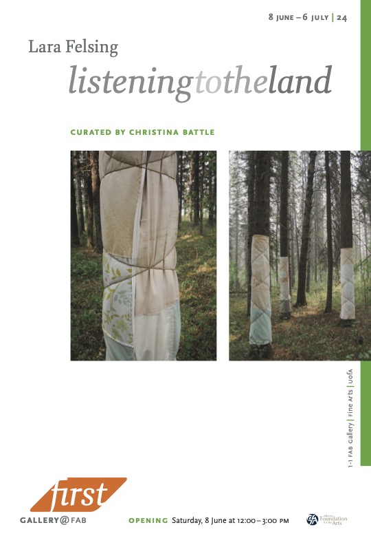 An exhibition rooted in collaboration, conversation, and knowledge-sharing, Listening to the Land presents recent works by Treaty 6 based artists Christina Battle and Lara Felsing. Considering our relationships to land and community, as well as the potentials of artistic gesture during times of crisis, this exhibition invites viewers to engage in conversations centering caring and careful perspectives of approach.