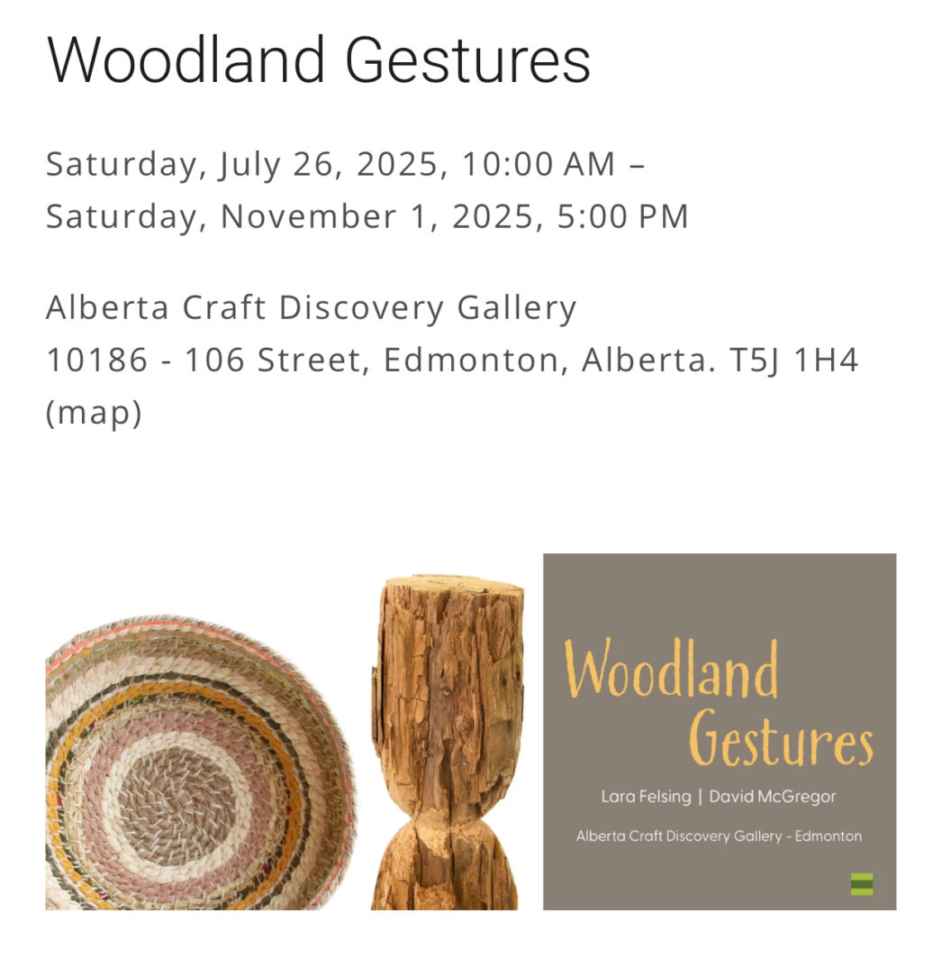 Woodland Gestures, a collaborative exhibition by Lara Felsing and David McGregor, invites connection with the complexity of Alberta’s forest ecosystems. Centered on generative interactions with the land, the work reflects each artist’s distinct approach to gathering. Through attentive presence, the artists express a shared kincentric relationship with the natural world and a deep care for the places they inhabit and explore.