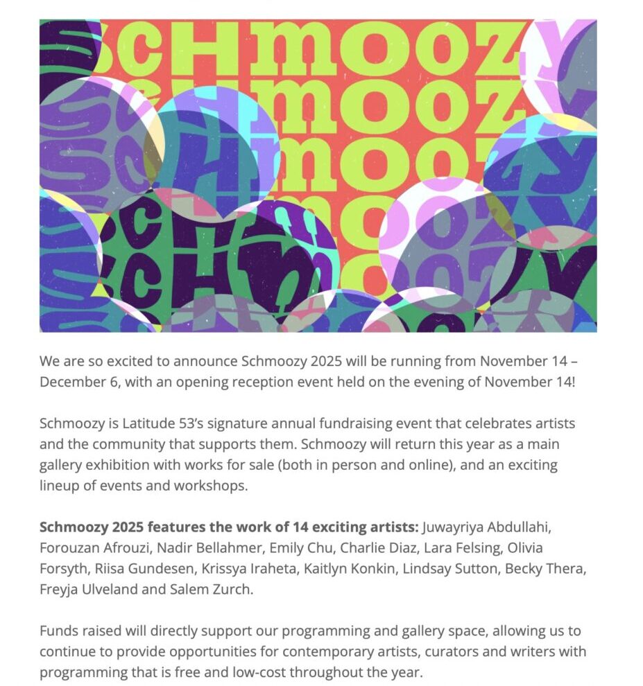 Artists: Mohammad Abbasi, Forouzan Afrouzi, Erin Boake, Raneece Buddan, Lauren Chipeur, Lara Felsing, Megan Feniak, Cheyenne LeGrande, Simone Saunders, Angeline Simon, Taiessa, Teresa Tam, Allison Tunis, Alex R.M. Thompson